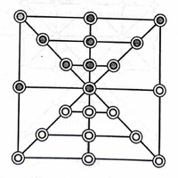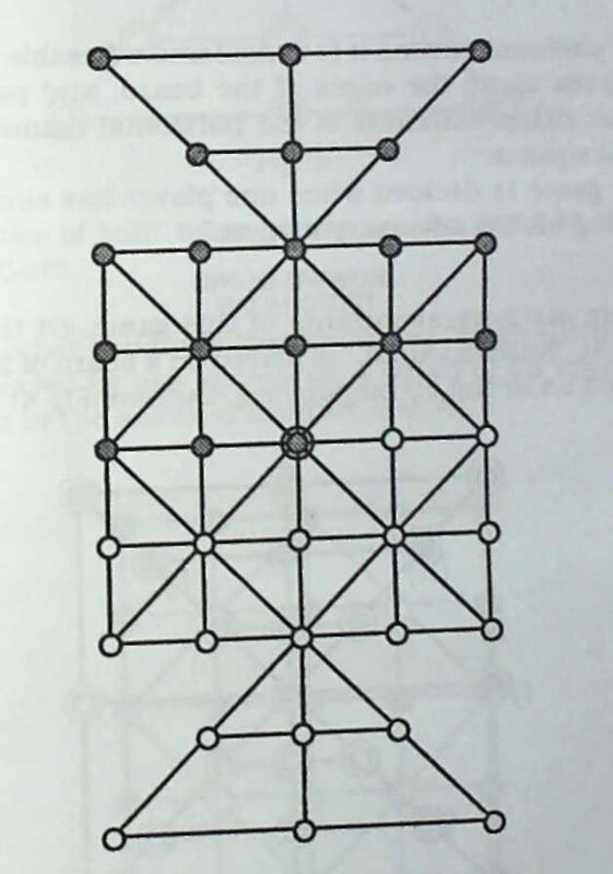 5x5 intersecting lines, with diagonals in each quadrant. Two triangles, the apexes of which intersect with the square at the midpoint of opposite sides. One line bisecting the base of the triangle, and another bisecting this line. Eighteen pieces per player, each side arranged on one side of the board, with the central point empty and the player's pieces on the points to the right of it. Players alternate turns moving one of their pieces to an empty point. A piece may jump an opponent's piece to capture it. Multiple captures are allowed. The player who captures all of the opponent's pieces wins.