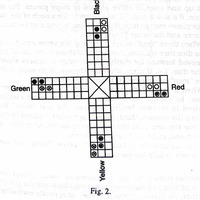 The game is played by four players on a cross-shaped board, each player having four pieces. Black and yellow play in partnership against red and green. Three four-sided dice control the moves of the pieces, the numbers on the dice being 1, 2, 5 and 6.