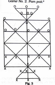 - This game is played by two men, each holding 14 ballets marked X and O in his possession according to the image provided in the text. The rule is that one player starts the game and moves one of his pieces from one cross- point to another and takes hold of the piece of the other man if the cross-point next to it is vacant. In this way the player who can capture all the pieces of the opponent wins the game.
