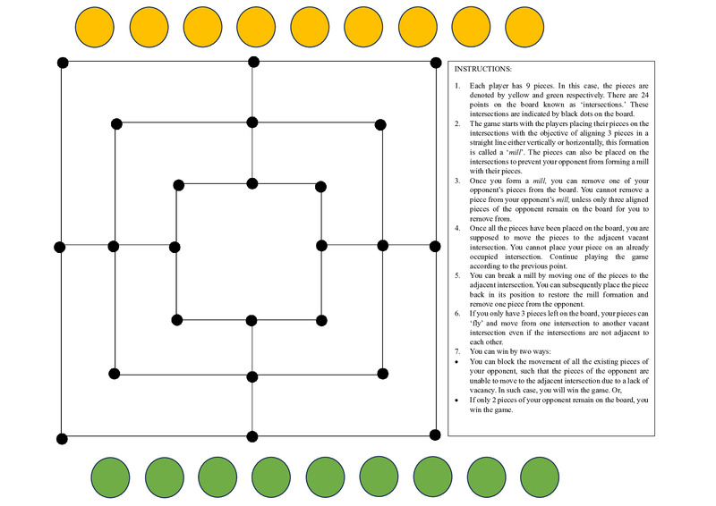 - This is a downloadable resource of a Nine Men's Morris Game one can download and play referring to the rules and using the given pieces.
