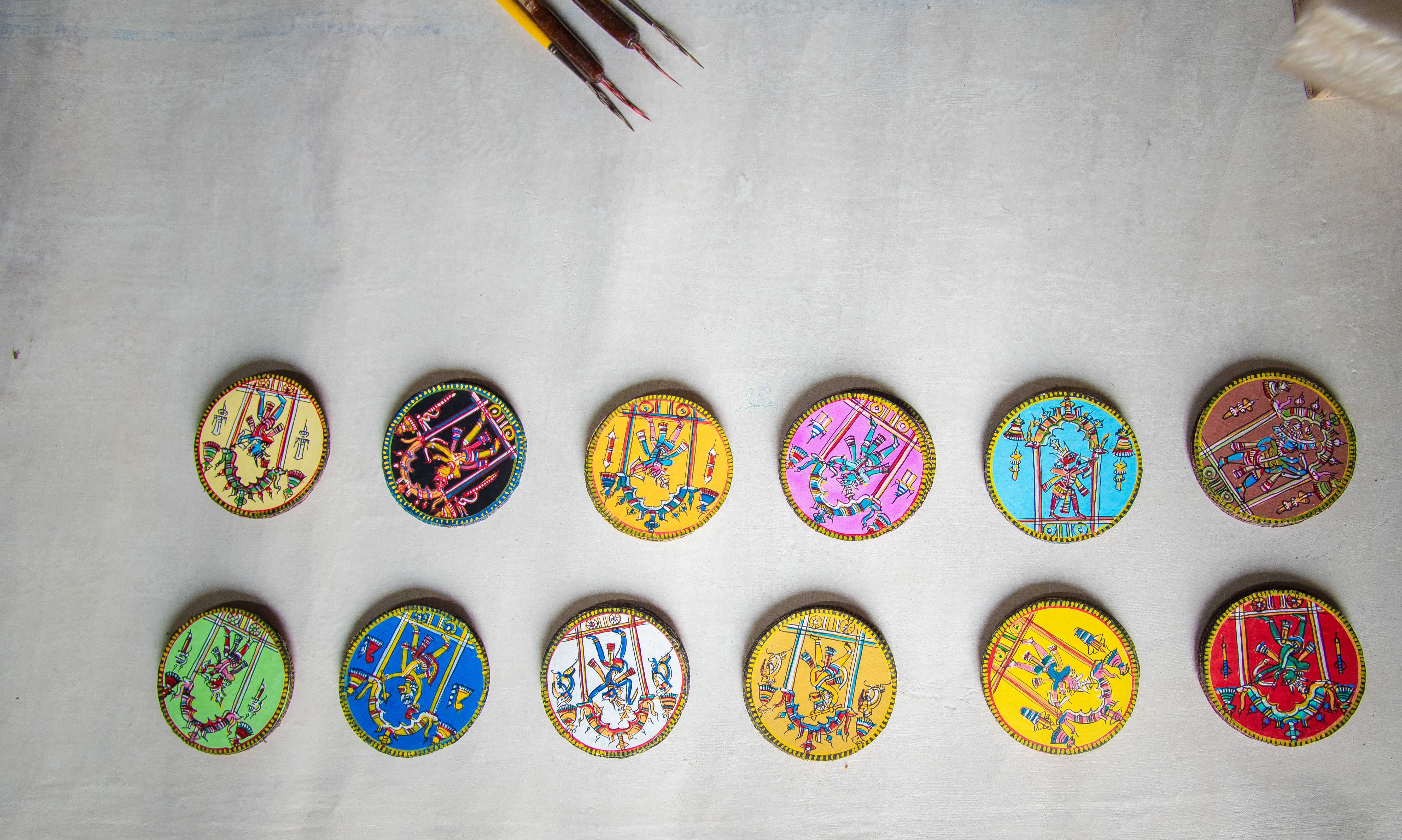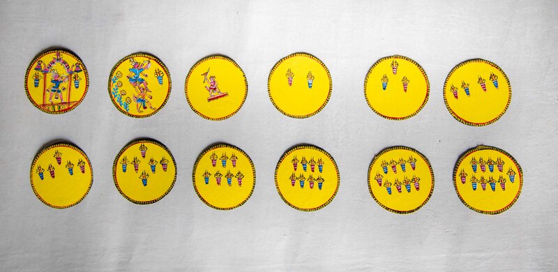 Satyanarayan Maharana mainly makes Ramayana painted Ganjapa cards. Ramayana painted Ganjapa cards consists of a set of 144 cards, comprising of 12 suits, with 12 cards in each suit and requires 4 players. Ram has 6 suits namely, Ram, Lakshman, Makar (team of monkey), Bhalu (jambuban), Parvat and Bibhishan. Ravana’s team also comprises of 6 suits namely, Ravana, Kunt, Katari,Sul, Pasho and Khanda. Every suit has a king card, a vizier card, an Ace and numbered cards from 2 to 10, 2 being highest and 10 being lowest. The numbered cards have unique symbols drawn on them and the number of symbols drawn signifies the number of the card. While playing, once the cards are randomly distributed, the player who receives the Ram card and the player sitting opposite to him belongs to the Ram lobby, making the other two players part of Ravana’s lobby.
