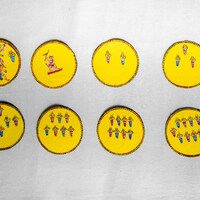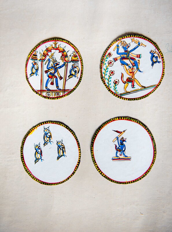 The images here showcase Ramayana Ganjifa or Ganjapa by Satyanarayan Maharana of Ghoraghatpura, one of the last remaining artists of Sonepur Ganjifa cards at Odisha. His family has been involved in making Ganjifa cards for generations and he has learnt the art from his father. His wife, Umavati Maharana is also an artist who makes Ganjifa cards. They are additionally artists who make patachitra paintings as well. Ganjifa cards are hand painted cards made out of cotton cloth, tamarind seed powder and khari mati (chalky soil). After the base of the cards are prepared, they are painted. While there are variants like Navagunjara, Ashtamala, Satyanarayan Maharana mainly makes Ramayana painted Ganjapa cards.