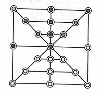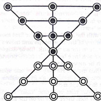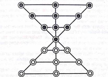 The moves are much the same as those of a king in draughts. Le., a piece can be moved one space at a time in any direction, backwards or forwards, provided that the space to which it is sought to move it is vacant and is in the same rank, file or diagonal as that from which it starts. Captures are made, as in draughts, by leaping over the piece to be captured in any direction, provided that all three spaces are in the same straight line. Any number of pieces may be captured in succession in one move. In no part of the board is a piece safe from capture : not even in its own bungalow, as the triangular excrescences at either end of the board are called. It is considered advisable to occupy the spaces along the edges of the board, and particularly those at either extremity of the horizontal diameter of the original square.