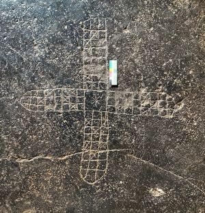 This is a chaupar grafitti board documented in Bhaja cave number 12 which is the chaitya griha of the bhaja cave complex. According to anthropologists K. Ravi and Jaya Sankar Rao and the classification of HJR Murray in his book, The History of Boardgames Other Than Chess, Chaupar is categorised as a Race Game. It is typically a four player game and the pieces belonging to each player is distict from the others. It is played with four pieces and a throwing of either cowrie shells or two oblong dice. There are various terminologies used for the safe squares, or the throws which differs from one region to the other. For example, in Haryana the central home which is a flower here is called 'charon ka ghar' (Bhattacharya, Finkel and Soni 2011). Interestingly, it can be played by a throw of six cowrie shells or even more depending on the variant. As this etched board is from Maharashtra, it is difficult to understand the exact throw of dice or cowries used or the rules made to play this game. There is currently a version of chaupar in Maharashtra called Saripat.