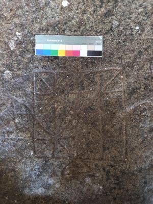- Game board engraved/excavated on rock floor of a porch.