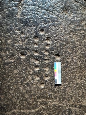 This mancala board is engraved on the floor of the main chaitya griha or cave number 8 in Karla. As the image shows, is a two-row mancala with 7 holes consisting both sides. There are also two depressions on the two extreme left and right side of the carving which could be the space to keep the winning seeds. The graffiti measures to 36cm and the diameter of each hole is 3cm approximately. This Graffiti board lies on the left side of the Stupa.