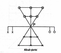 Kaua Dorki This game has been recorded by Charu Chandra Das Gupta in 1983 at Kosam village situated in the district of Allahabad. The informant of the game was Bacchu Singhala who was an inhabitant of the village. Das Gupta in his short essay further mentions about the similarities of Kaua Dorki and Egara-guti, or Lau-Kata-Kati or even Nao-Gutiya. The board as shown in the image has a common characteristic with the other games mentioned, which is that the two triangles meet each other at the apex. But one unique aspect of this game is that there is an additional horizontal line, intersecting the central point marked P, to which two vertical lines are drawn on each side and on where two pieces in possession of each player are placed at the beginning of the game.