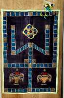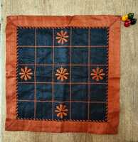 This board is made by Ramsons Kreera Pratisthan on Kalamkari. They are working towards the revival of traditional Indian Boardgames through manufacture of handmade boards, casting pieces and counters. They collaborate with artists and artisans all across India to make such boardgames and their material have a number of varieties such as, Navalgund Jamkhana, Silk embroidery, Batik print, Mysore silk zari weaving etc. Other than variants in types of cloth and handloom they also manufacture boardgames on Marble, Mysore wood, Brass Casting, Wood Polychrome and many as such.