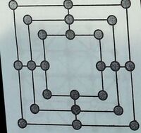 Sujjua This game was documented by Humphries on his visit to Baldewa which was a ruined Chandel temple a few miles away from the Karvi railway station. He recorded this board etched on one of the vertical slabs on the wall of the inner shrine. According to his speculations, the game was etched on stone and this stone was part of the floor before the stone was used for the construction of the temple. This game is called Sujjua. He explains that this game was played on a board of twenty four spaces and it is a two player game. The objective of the game is to match three pieces which he terms as ‘men’ in one row before the opponent can do it. When the game commences the board is clear and the players move alternately, each commencing by placing one of his own men on the board in any vacant place. After the first move, the player may either place another "man" on the board, or may move a piece already on it one space at a time in any direction, provided that the space to which he wishes to move it is vacant.
