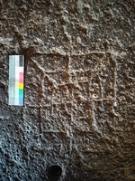 This mancala board is engraved on the floor of the main chaitya griha or cave number 8 in Karla. As the image shows, is a two-row mancala with 7 holes consisting both sides. There are also two depressions on the two extreme left and right side of the carving which could be the space to keep the winning seeds. The graffiti measures to 36cm and the diameter of each hole is 3cm approximately. This Graffiti board lies on the left side of the Stupa.