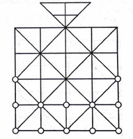 Two players are necessary for playing this game, one in charge of the tigers and the other in charge of the goats. The tigers are 4 in number while the number of the goats is 20. Before the commencement of the game, the tigers are arranged at the places indicated in the figure by the circles and 4 goats are kept on any 4 cross-points according to the discretion of the player. The move begins with the man who has got the tigers, and the player who has the remaining 16 goats in his hand must place all of them on the cross-points one after another before he may move any goat on the diagram from one cross-point to another. The player with the tiger tries to capture as many goats as he can while the other player aims at checkmating his opponent.