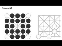 Kulaochal This game has been documented by D.N Majumdar in Jharkhand. It is a popular game played by the Ho community. This game as he explains through the structure of the board or the game pieces is similar and is another variant of Bagh Chal. He also mentions this to be similar to shola guti or sixteen pieces. According to him the game is played by drawing the board on the ground. A quadrilateral diagram is drawn with chalk on the ground. The diagonal is intersected by three equidistant parallel, lines drawn within it perpendicularly and three horizontally. Two lines are then drawn diagonally so as to intersect each other at the centre of the diagram. Finally the middle points of each of the sides of the quadrilateral are joined by four straight lines. A guti or a piece of the game is represented with the name of ‘kulao’ being tigers and ‘meroms’ being goats. As per the rule of this game there should be four kulaos and twenty meroms placed on the board. The pieces could be used in the form of local stones, or seeds or similar materials. The gutis are placed at each of the twenty points of junction of the three horizontal lines with the three perpendicular lines and with the four sides of the quadrilateral. Two players sit face to face on two sides of the drawn board.