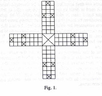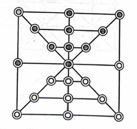 This is another game recorded by E. De. M. Humphries in Karwi, a district in Uttar Pradesh a kind of “Solitaire,” known as “Kowwa Dand.” As written by Humphries he had difficulty recording the rules of this game, as the man who showed him the diagram had forgotten them, and the only man in the village who knew the game at all, had not played it for years.