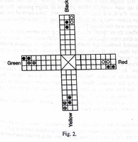 This variant of Pachisi has been recorded by by E. De. M. Humphries in Karwi, a district in Uttar Pradesh. It is known as Chonpa or Chaunsarh. According to Humphries, Another variant is known as “Chonpa” or “Chaunsarh.” It is a four player game, each having four “men,” coloured respectively black, yellow, green and red as shown in the image. The two former play in partnership against the two latter colours. The board is the same as a Pachisi board with the exception that the safe squares mentioned in the case of pachisi are either not marked at all or are disregarded, if the board is one made for both games. A single piece may, and a pair may not, be captured on any square to which a hostile piece may be moved. The moves are regulated by throwing three dice: not, as in the case of Pachisi, —cowries. These dice as documented were of bone or ivory and are about 2% inches long, marked on their long sides with the numbers (1), (2), (5) and (6).